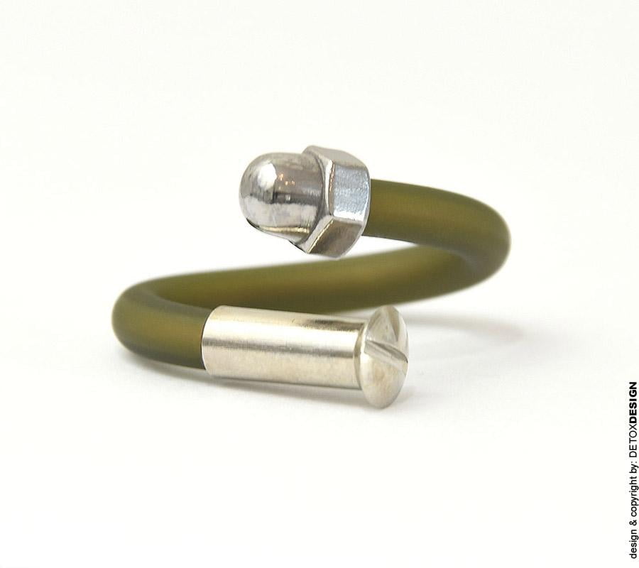 Pierścionki z najwyższej jakości włoskiego kauczuku w szlachetnie oliwkowym kolorze z zakończeniami ze stali nierdzewnej. Pasuje na każdy palec – można dowolnie regulować rozmiar. Zaskakuj i zachwycaj wszystkich – ciesz się tym! Pierścionki z kolekcji 'KOBRO’ zaprojektowanej specjalnie na najbardziej prestiżowe wydarzenie moda w Polsce – FASHION PHILOSOPHY/FASHION WEEK POLAND (14 edycja/2016).
